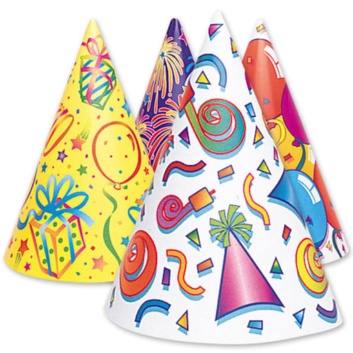 Bunte Partyhütchen mit fröhlichem Polka-Dot-Muster in verschiedenen Farben. Die Hüte sind aus Karton gefertigt und haben eine Höhe von ca. 16 cm. ...