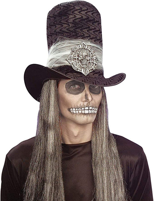 Vollständige Details anzeigenGothic Samt Zylinder mit Totenkopf Medaillon - Schwarz Silber | Halloween Kostüm