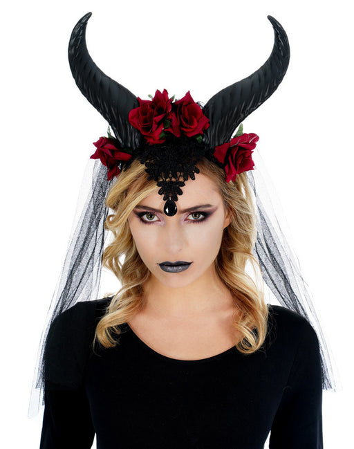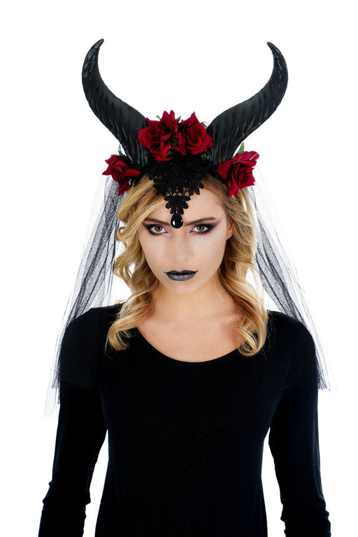 Vollständige Details anzeigenHaarreif mit Hörnern, Rosen und Schleier - Schwarz / Rot