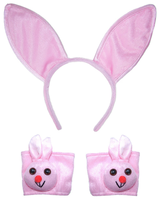 Süßes Häschen-Set für kleine und große Hasen bestehend aus einem Haarreif mit rosafarbenen Häschen-Ohren und Pulswärmern mit niedlichen Hasen-Gesic...