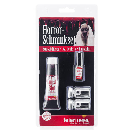 Tolles Halloween Schmink Set, bestehen aus Blut, Narbenfluid und Kontaktlinsen in Rot.