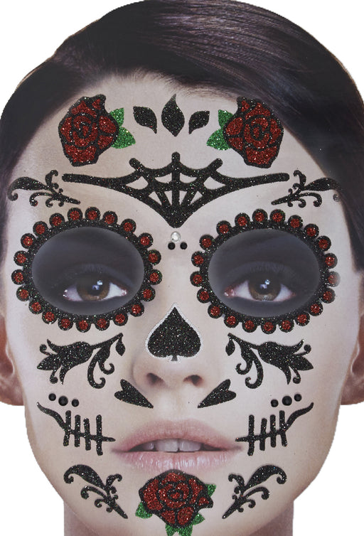 Mit diesem tollen Glitzer-Gesichts-Tattoo-Set vervollständigen Sie schnell Ihr Day of Dead Kostüm. Noch dazu sind die Tattoos kinderleicht anzubrin...