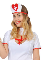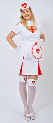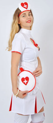 Das kurze Nurse Kleid ist sehr figurbetont geschnitten und mit Falten am Rock versehen. Für mehr Beinfreiheit kann die Naht an den Falten auch vorsichtig entfert werden. Das Minikleid wird hinten mit einem Reißverschluss geschlossen. Der große Ausschnitt in Herzform ist mit einem roten Kreuz aus Bändern in Satin Optik verziert. Das passende Krankenschwester Häubchen, sowie die süße mit Spitze verzierte Tasche werden natürlich auch mitgeliefert.