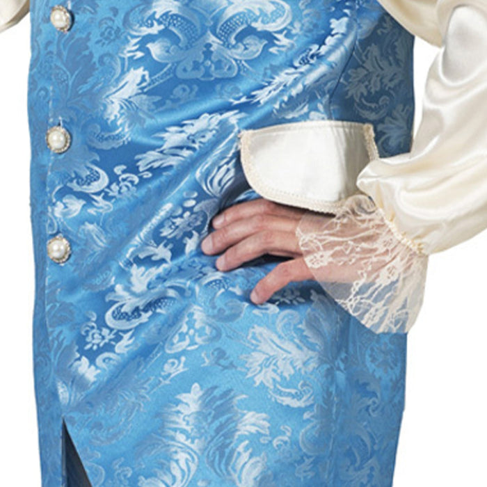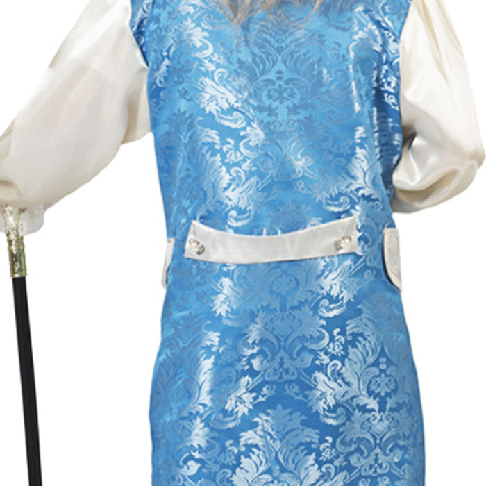 Das Kostüm besteht aus edlen Materialien, die den Charme und die Pracht des Barockstils perfekt widerspiegeln. Das leicht glänzende Material in einem eleganten, hellen Blau wird durch kunstvolle Ornamentmuster veredelt, die dem Outfit eine königliche Ausstrahlung verleihen. Der cremefarbene Stoff in satinierter Optik ergänzt den Look auf elegante Weise und sorgt für einen luxuriösen Eindruck. Die Verkleidung besteht aus einer stilvollen Weste, die mit einem eingearbeiteten Hemd kombiniert ist, sowie einer dreiviertellangen Hose, die dem traditionellen Barock-Look entspricht.