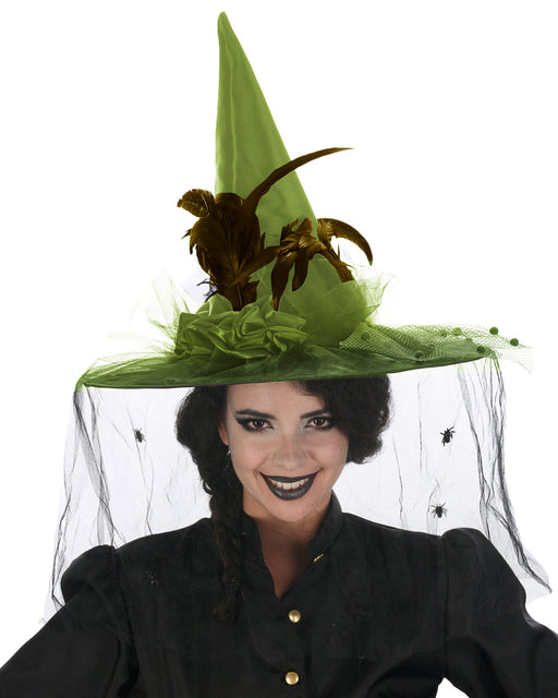 Vollständige Details anzeigenHexenhut "Rowena" mit Schleier und Federn | Grün