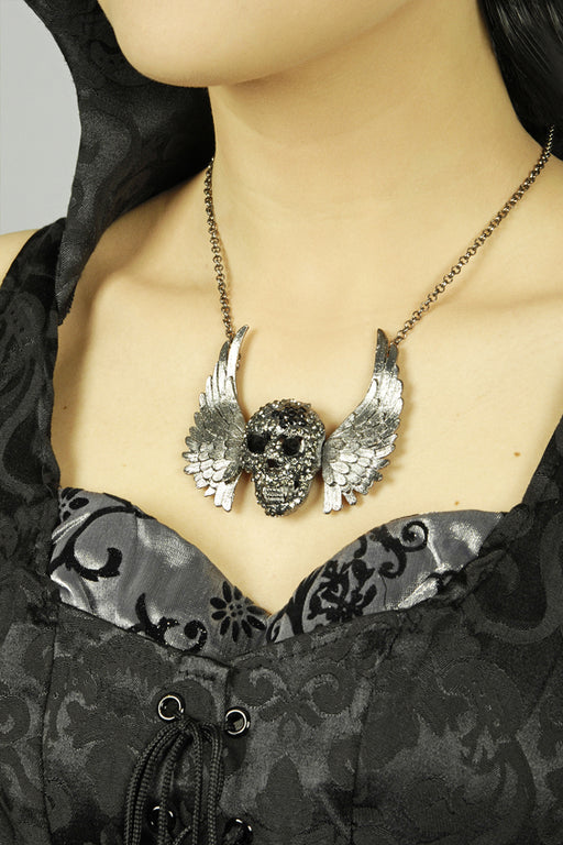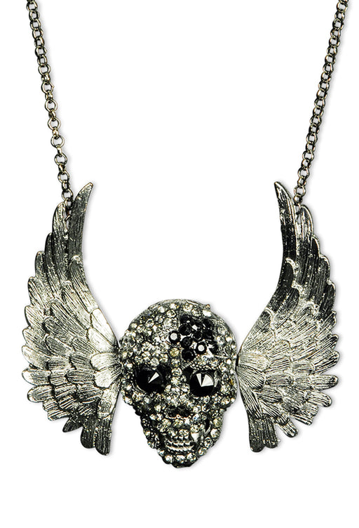 Diese schaurig schöne Kette ist mit einem geflügelten Totenkopf mit schwarzen Schmucksteinen als Augen bestückt. Glitzernder Strass veredelt den gr...