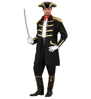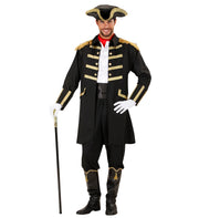 Der knielange Mantel ist in elegantem Schwarz gehalten und mit goldfarbenen Knöpfen sowie Zierborten veredelt – ein echter Hingucker! Die ausgestellten Ärmel, der Kragen im Uniform-Stil und die elegante Passform verleihen dem Kostüm eine historische Anmutung, die perfekt zu einer Piratenrolle passt. Der passende schwarze Hut mit goldenen Verzierungen rundet den Look authentisch ab.