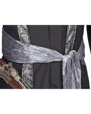 Das schwarze Piratenhemd wirkt, als hätte das Hemd eine zusätzliche Weste. Am Kragen befindet sich eine Schnürung und silberne Rosenborten verzieren das Kostümoberteil zusätzlich und geben dem Oberteil einen romantischen Touch. Um Ihre Figur zu betonen, befindet sich am Oberteil eine angenähte leicht glänzende graue Schärpe.