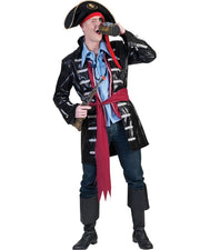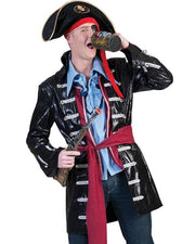 Geliefert werden hier die längere Jacke mit eingearbeiter Weste und Rüschenhemd. Die Jacke aus Lederoptik ist toll mit silberfarbenen Borten, Knöpfen mit Totenköpfen und Schulterpolstern gearbeitet. Das Seeräuber Kostüm wird mit einem roten Bindegürtel geliefert. Ergänzen Sie das tolle Partykostüm noch mit einem Piratenhut Ihrer Wahl und schon haben Sie eine tolle Verkleidung für Karneval, Mottoparty und Fasching.
