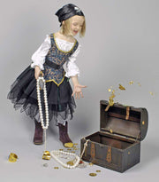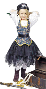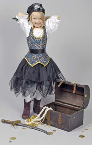 Mit diesem tollen Karnevalskostüm für Kinder wird Ihr kleiner Schatz zu einer richtigen Piratin! Das Kostüm besteht aus einem wunderschön gearbeiteten Kleid mit Gürtel. Der Rock des Kleides ist in einem schillernden Ozeangrün mit viel schwarzen Tüll. Das Oberteil des Kleides ist mit goldenen Ornamenten bedruckt. Die Ärmel sind einer weißen Satinbluse nachempfunden. Damit ist Ihr kleiner Seeräuber perfekt eingekleidet.