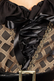 Das aufwendig gestaltete Kleid besticht durch seinen figurbetonten Schnitt, der die Taille elegant hervorhebt und eine feminine Silhouette zaubert. Das gemusterte Oberteil im Korsagen-Stil sorgt für einen authentischen Piratenlook, während die fließenden Ärmel und der asymmetrische Rock dem Kostüm Dynamik und Bewegungsfreiheit verleihen. Goldfarbene Zierdetails setzen stilvolle Akzente und unterstreichen den luxuriösen Charakter dieses Seeräuberinnen-Outfits.