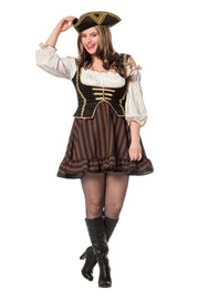 Das Kleid überzeugt durch seinen authentischen Farbton in Braun mit schwarzen Akzenten und goldfarbenen Zierdetails, die dem Outfit eine edle, abenteuerliche Note verleihen. Das enganliegende Oberteil im Korsagen-Look betont die Taille und sorgt für eine schöne Silhouette, während der ausgestellte Rock mit Streifenmuster Bewegung und Dynamik in den Look bringt. Die schulterfreien Ärmel im Blusenstil unterstreichen den klassischen Piratinnen-Charakter und verleihen dem Kostüm eine elegante Leichtigkeit.