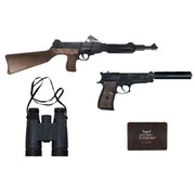 Das Agent Spielzeugwaffenset besteht aus einem Gewehr, einer Pistole, einem Fernglas und einem Secret Agent Ausweis. Der Großteil der Waffen wird aus robustem Druckguss Metall hergestellt. Die Griffschalen der Spielzeugwaffen und das Fernglas bestehen aus robustem Kunststoff. Das Fernglas ist nur als Spielzeug anzusehen! Da sich die Pistole und das Gewehr nur schwer von echten Waffen äußerlich unterscheiden, sollten Sie nur von Erwachsenen geführt werden.
