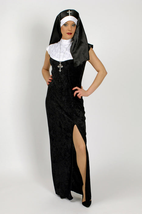 Mit diesem Nonnen Kostüm verführen Sie die Mönche und Priester! Das Kostüm besteht aus einem langen, aus samtähnlichen Material hergestellten, schwarzen Kleid mit hohem Beinschlitz und einer Kopfhaube mit Kreuz. Der weiße Kragen am Kleid betont die schulterfreien Arme besonders gut.