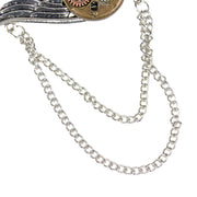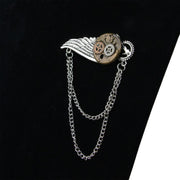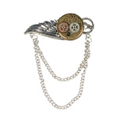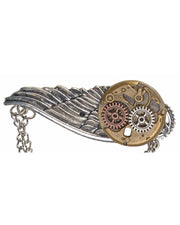 Das Schmuckstück kombiniert verschiedene Metalloptiken in Silber, Kupfer und Altgold und besticht durch ihre aufwendige Gestaltung. Ein filigraner silberfarbener Flügel steht im Kontrast zu einem altgoldenen Getriebe, das mit mehreren zahnräderartigen Elementen in Kupfer und Silber verziert ist. Zwei locker fallende Metallketten ergänzen das Design und verleihen der Brosche eine zusätzliche Portion Dynamik und Bewegung – ganz im Sinne des Steampunk-Genres, das Technik und Ästhetik auf originelle Weise verbindet.