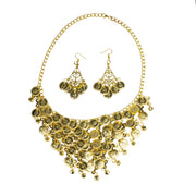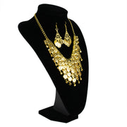 Das Collier liegt elegant am Hals an und überzeugt durch sein reich verziertes Design im Statement-Stil. Die baumelnden Münzen reflektieren das Licht bei jeder Bewegung und sorgen so für zusätzliche Aufmerksamkeit – besonders auf der Bühne oder beim Tanzen. Die Ohrhänger sind fein gearbeitet und leicht genug, um auch über längere Zeit angenehm getragen zu werden. Gemeinsam ergeben Kette und Ohrringe ein harmonisches Gesamtbild, das jedes Kostüm aufwertet.