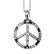 Was wäre ein Hippie Outfit ohne die typische Peace Kette? Diese sehr schön gearbeitete Kette mit großem Peace Anhänger ist ideal um Ihr Hippie Kostüm zu ergänzen. Der Anhänger ist mit HOPE LOVE und PEACE beschriftet und mit kristallfarbenen Schmucksteinen verziert. Die lange silberfarbene Kette und der große Anhänger sind sehr schön gearbeitet. Die Kette wird mit einem kleinen Karabiner Haken geschlossen und hat ein kleines Verlängerungskettchen.