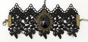 Das Armband ist aus schöner schwarzer Spitze gefertigt und mit einem schwarzen Schmuckstein verziert. Ein Ebenbild bildet hier der mit dem Armband verbundene Ring. Dieser ist ebenfalls mit einem schwarzen Schmuckstein verziert. Durch die schwarze Spitze und die kleine Metallkette zwischen Armband und Ring wirkt der Schmuck besonders edel.