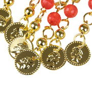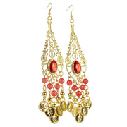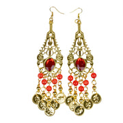 Von der goldenen Basis hängen mehrere Stränge mit glänzenden roten Perlen und goldenen Münzanhängern, die bei jeder Bewegung sanft mitschwingen. Diese Kombination sorgt nicht nur für ein lebendiges, verspieltes Design, sondern erzeugt auch ein leises, klingelndes Geräusch, das den orientalischen Charakter dieser Ohrringe zusätzlich unterstreicht.