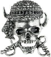 Der Statement Ring ist als silberner Skull mit zwei überkreuzenden Säbeln und einem Kopftuch aus grauen und schwarzen Schmucksteinen gestaltet und zieht bestimmt viele Blicke auf sich. Da der Ring größenverstellbar ist, passt er sowohl Damen, wie auch Herren.