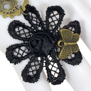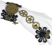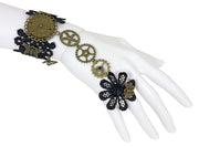 Das Schmuckset besteht aus einem schwarzen Spitzenarmband mit verbundenem Ring. Neben unterschiedlichen Verzierungen im Antik Gold Look, wie ein Ziffernblatt, Schmetterlinge und Ornamente, finden sich als Verbindungsglied zwischen Armband und Ring drei Zahnräder. Den Ring ziert eine Blume aus schwarzem Spitzenmaterial, auf der ein kleiner Butterfly aus Metall sitzt. Geschlossen wird der Armschmuck mit einem Karabinerhaken.