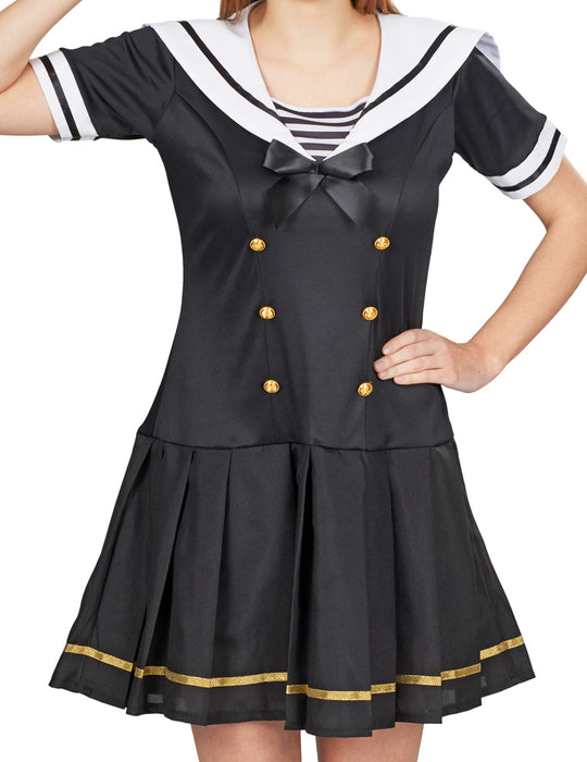Das schwarze, halbärmelige Minikleid im Navy-Stil hat einen schönen großen Matrosenkragen, dessen V-Ausschnitt vorne mit einer großen schwarzen Schleife verziert ist. Sowohl der Kragen, wie auch die weißen Ärmelabschlüsse haben eine Verzierung mit einem schwarzen Band, wodurch der maritime Charakter besonder gut zur Geltung kommt. Goldene Knöpfe und ein goldener Zierstreifen am Rocksaum machen das Kostümkleid zu einem besonderen Hingucker.