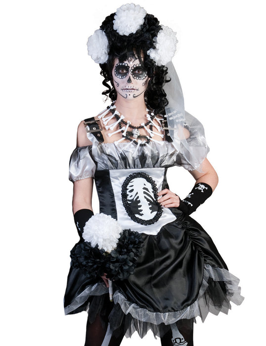 Das Kostüm besteht aus einem aufwendig gearbeiteten schwarz-weißen Kleid aus Satin und Tüll. Das Skelett-Motiv zieht mit Sicherheit viele Blicke auf sich. Und was wäre eine Braut ohne ihren Schleier? Diesen liefern wir natürlich in schönem Knochenweiß mit.