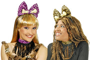 Das Set besteht aus einem Haarreif mit einer großen Schleife und einem eingebundenen Knochen. Dazu gehört noch das passende Halsband mit Fransen. Das komplette Set ist im Leoparden-Look gehalten und in verschiedenen Varianten erhältlich.
