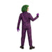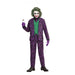 Das mehrteilige Kostüm besteht aus einer düsteren Clownjacke, einer passenden Weste, einer Hose und einer klassischen Krawatte – alles abgestimmt in den Farben Lila, Schwarz und Grün. Der Look kombiniert klassische Clown-Elemente mit einem verstörenden Horror-Stil wie schräge Muster.