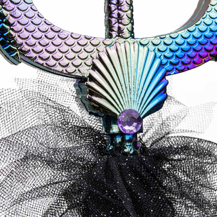 Der beeindruckende Dreizack hat eine stattliche Länge von ca. 44 cm und liegt leicht in der Hand – ideal also auch für längere Partynächte. Gefertigt aus robustem Kunststoff, ist das Accessoire sowohl stabil als auch angenehm leicht. Der Stab selbst ist mit schwarzem Tüll und Netzstoff verziert, was ihm eine geheimnisvolle, fast magische Note verleiht. Die dreifache Gabel an der Spitze schimmert in irisierenden Farben, die je nach Lichteinfall funkeln und glänzen – perfekt für alle Meerwesen, die sich gerne von ihrer schönsten Seite zeigen.