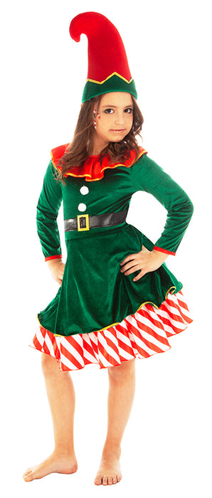 Die weihnachtliche Verkleidung besteht aus einem samtigen Kleid in Grün mit roten Kragen und einer lustigen Weihnachtselfen Mütze. Das Mädchenkleid endet am Saum ganz frech in einem Band aus rot weiß gestreiftem Stoff und erinnert so an die süßen Zuckerstrangen zu Weihnachten.