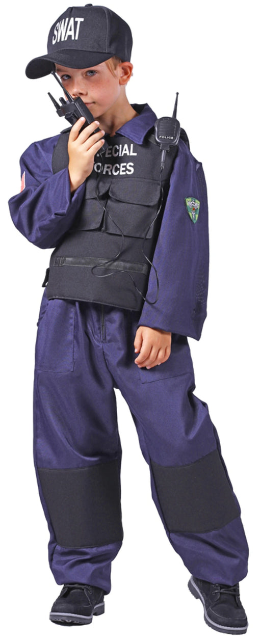 • Cooles S.W.A.T Kostüm für Kinder • Lieferumfang: Overall, Weste, Mütze und (Spielzeug-)Walki Talki • Material: 100% Polyester • Farbe: Blau / Sch...