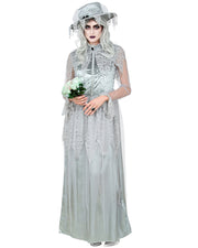 Dieses Geisterbraut-Kostüm ist der Schlüssel zum Reich der Untoten. Geliefert wird ein bodenlanges graues Kleid, das mit Totenkopf-Spitze und einer Knopfleiste verziert ist. Das auffällige Kleid hat Ärmel aus grauem Tüll, passend dazu wird ein grauer Hut geliefert, der das Kostüm komplett macht. Mit diesem Outfit werden Sie der Hingucker auf jeder Halloweenparty und können so manchen Partygästen einen Schrecken einjagen.