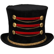 Besonders ins Auge fallen die goldenen Knöpfe mit roten Bändern auf der Front, die dem Zylinder eine außergewöhnliche und detailreiche Gestaltung verleihen. Diese Kombination macht den Hut zum perfekten Accessoire für Magier, Zirkusdirektoren, Showkünstler oder Varieté-Darsteller.