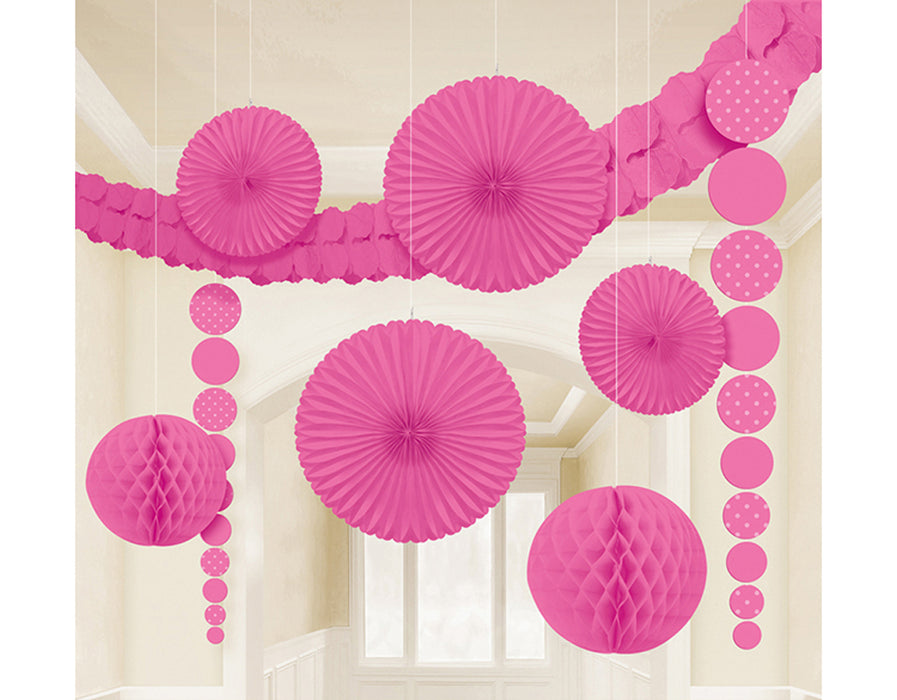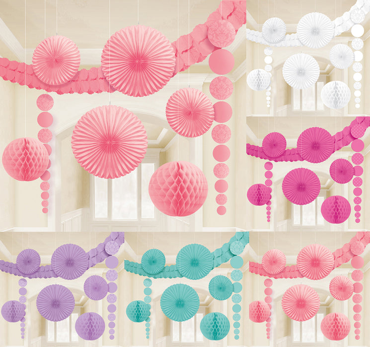 Die schönen Dekorationsartikel sind in verschiedenen Farben wie Pink, Rosa, Weiß, Türkis oder Lila verfügbar. Die Artikel sind sehr schön farblich abgestimmt und teilweise mit feinen Ornamenten oder Punkten verziert. Ein Set besteht aus einer Girlande, zwei Wabenpapier-Bällen, zwei Deckenhängern, zwei kleineren und zwei größeren Deckendeko Papier-Fächern.