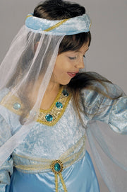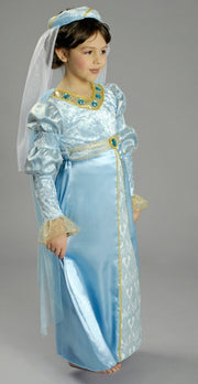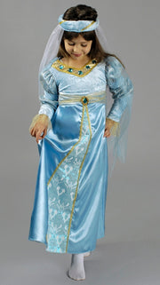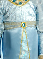 Mit diesem tollen Kostüm für Mädchen bestehend aus einem langen Kleid mit Stirnreif verwandeln Sie Ihre Tochter im Nu in ein kleines Burgfräulein oder eine Prinzessin. Das Oberteil des Kleides ist aus einem hellblauen Material gefertigt, die langen Puffärmel sind mit goldenem Glitzerstoff verziert, eine goldene Borte mit Schmucksteinen ziert den Ausschnitt. Der lange Rock aus einem Stoff in Satin Optik ist mit einem Einsatz aus wunderschönem Stoff mit glitzernden Ornamenten versehen. An der Taille ist ein Band aus feinem Stoff angebracht, welcher mittig mit einem großen Schmuckstein verziert ist. An den Schultern ist eine feines Schleiertuch angenäht, welches wie eine kurze Schleppe aussieht. Das schöne Stirnband aus hellblauem Stoff in Samt Optik ist ebenfalls mit goldener Borte verziert und mit einem feinen Schleier versehen.