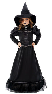 Das Mädchen-Kostüm ist in der eleganten Farbgebung Schwarz und Silber gehalten, silberne Borten und eine silberne Brosche mit schwarzem Schmuckstein runden die Optik ab. Das lange Kostümkleid hat am Rocksaum Überstoff aus Tüll und die Puffärmel machen das Kinderhexenkostüm zu einem ganz besonderen Hingucker. Abgerundet wird das exklusive Kostüm durch den zum Kleid passenden spitzen Hexenhut, mit einer extra breiten Krempe.