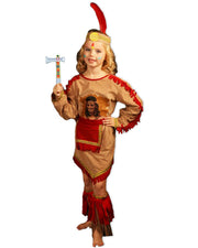 Das Kinder Kostüm besteht aus einem kurzen bedruckten Kleid in Wildleder Optik mit separatem Gürtel. Das Kleid ist schön mit Fransen verziert. Auch ein süßer Tomahawk aus Schaumstoff wird noch mitgeliefert.