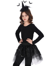 Verwandeln Sie Ihr Kind in eine schwarze Hexe mit diesem teuflisch schönen Set! Das 2-teilige Black Witch Set besteht aus einem Haarband mit einem Hexenhut und einem glitzernden, mehrlagigen Tüllrock. Das Highlight beim kleinen Spitzhut sind die kleinen schwarzen Fledermäuse, bei denen es so aussieht, als ob sie um den Hut herumfliegen. Der schwarze Skirt ist mit silbernen Spinnennetzen verziert. Ein tollen Kostümset für Ihr Mädchen zur nächsten Party an Karneval, Halloween oder Kindergeburtstag!