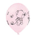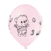 Das Set enthält 6 Ballons: 3 in zartem Rosa mit niedlichem Bärchen in Profilansicht und 3 in Weiß mit frontalem Bärenmotiv und bunten Details wie Luftballons und Schmetterlingen. Die Ballons sind aus 100 % Latex gefertigt und lassen sich mit Luft oder Helium befüllen.