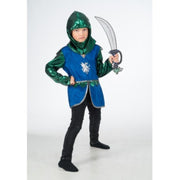 Das Oberteil zeigt auf der Brust ein stilisiertes Drachenwappen – Symbol für Stärke, Mut und Fantasie. Die Kombination aus tiefem Blau und grünen Ärmeln verleiht dem Kostüm einen klassischen, mittelalterlichen Charakter. Der bequeme Schnitt bietet viel Bewegungsfreiheit und eignet sich ideal für aktive Kinder, die gerne toben, spielen und sich verkleiden.