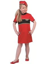 Das Kinderkostüm besteht aus einem Kleid, das im Rücken mit einem Reißverschluss versehen ist, und einem Stewardessen Häubchen. Durch den knalligen roten Stoff sieht das Kostüm sehr edel aus, es ist mit Flugabzeichen besetzt.